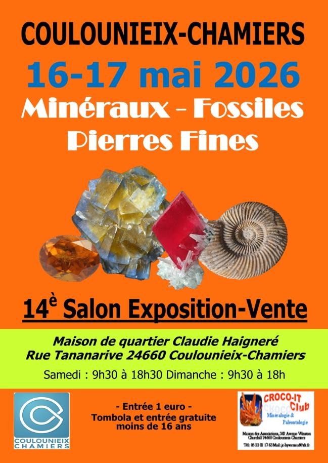 | COULOUNIEIX-CHAMIERS (24660)(près de Périgueux) / 14 ème Exposition-Bourse-Salon minéraux et fossiles / Maison de quartier Claudie Haigneré, rue de Tananarive / Je serai présente à ce salon / 16 et 17 mai 2026 |