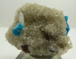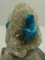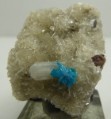 | CAVANSITE, stilbite / Carrière Wagholi, Ahmadnagar, Poona, Maharashtra, Inde / Belle petite pièce montrant un cristal clivé de cavansite. On se rencontre de l'aspect fibroradié du cristal. Il mesure 0,5 cm et repose sur un lit de stilbite blanche. | ![]() |