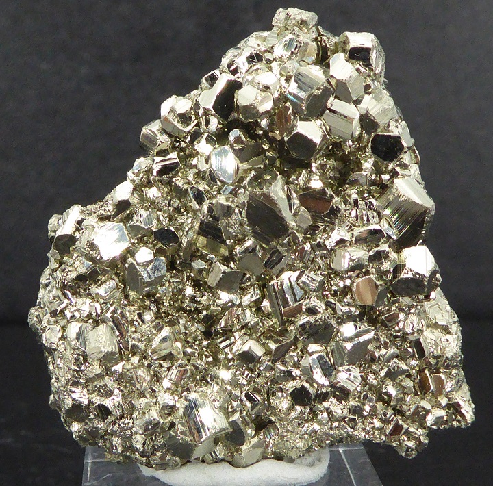 | PYRITE / Mine de Huanzala, district de Huallanca, Ancash, Pérou / Bonne pièce de pyrite cubique montrant des troncatures complexes et des striures sur les faces. Les cristaux sont très brillants à éclat métallique. Les plus grands mesurent 0,5 cm. | Disponible |