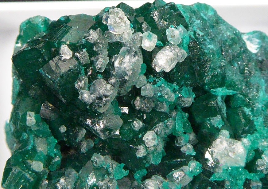 | Description : | Bel échantillon de dioptase d'un beau vert brillant. Les cristaux mesurent 0,3 cm pour les plus grands. Des cristaux blancs de calcite se trouvent sur la dioptase. |