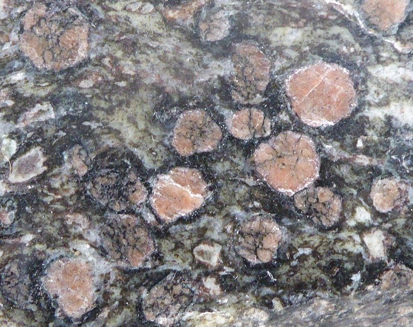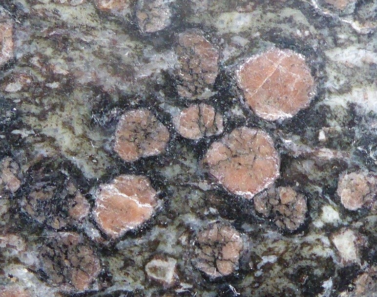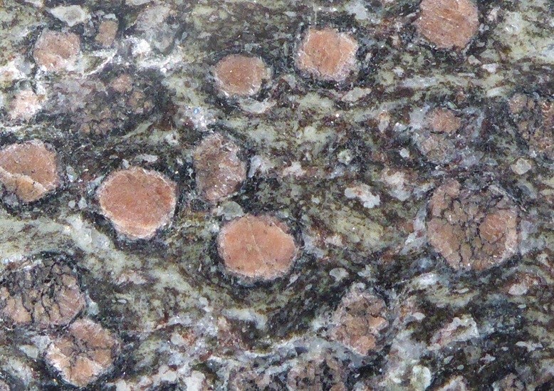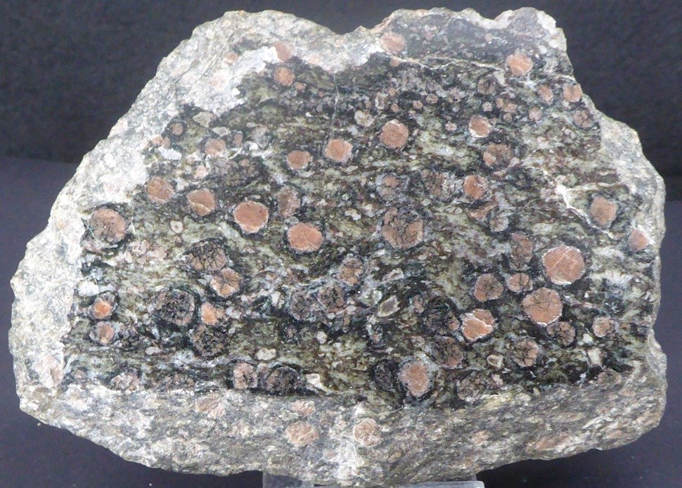 | Description : | Belle pièce d'éclogite avec une face polie montrant des sections de grenat mesurant jusqu'à 0,7 cm de diamètre. |