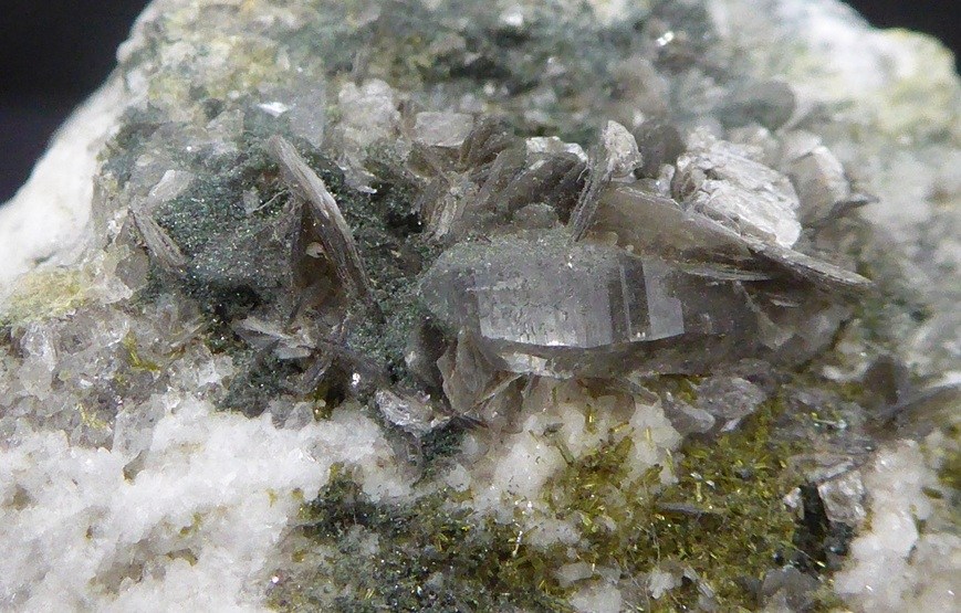 | Rajout Mars 2026 / QUARTZ, EPIDOTE, MICA / Vallée d'Ossola Piémont, Italie / Bonne pièce composée de cristaux de quartz hyalin de 0,8 cm pour les plus grands, de mica en feuillets de 0,3 cm et de fins cristaux d'épidote. | Disponible |