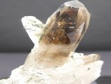 | Description : | Très belle cristallisation de quartz enfumé de 3,3 cm montrant un léger fantôme. Il est posé sur de l'albite massive d'où ressort quelques aegirines noires. |