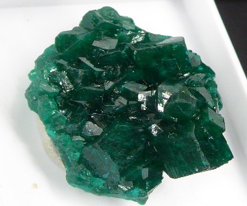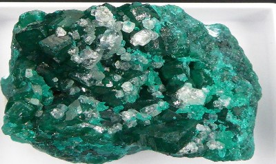 Rajout Décembre 2025 / DIOPTASE / Mine Tantara, Shinkolobwe, Katanga, R. D. du Congo / Bel échantillon de dioptase d'un beau vert brillant. Les cristaux mesurent 0,3 cm pour les plus grands. Des cristaux blancs de calcite se trouvent sur la dioptase. Livrée dans une boite plexi.