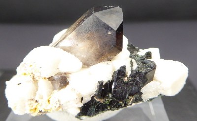 Rajout Mars 2026 / QUARTZ,AEGIRINE, ALBITE / Mont Malosa, Zomba, Malawi / Superbe pièce composée d'un quartz enfumé de 1,6 cm posé sur de l'albite cristallisée et d'aegirine noire. Une petit baguette d'un minéral non déterminé se trouve dans le quartz