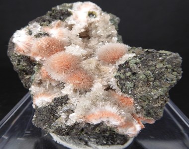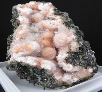 MESOLITE / Deshgaon, district de Khandwa, Madhya Pradesh, Inde / Très belle pièce de mésolite en boules blanches à rougeâtres fibroradiées de 0,6 cm pour les plus grandes. De la calcite se trouve sur la pièce.