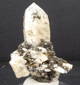 QUARTZ / Mine Panasqueira, Portugal / Jolie mono-cristal de quartz montrant un fantome. De la sidérite et de la pyrite microcristallisées se trouve sur la pièce.