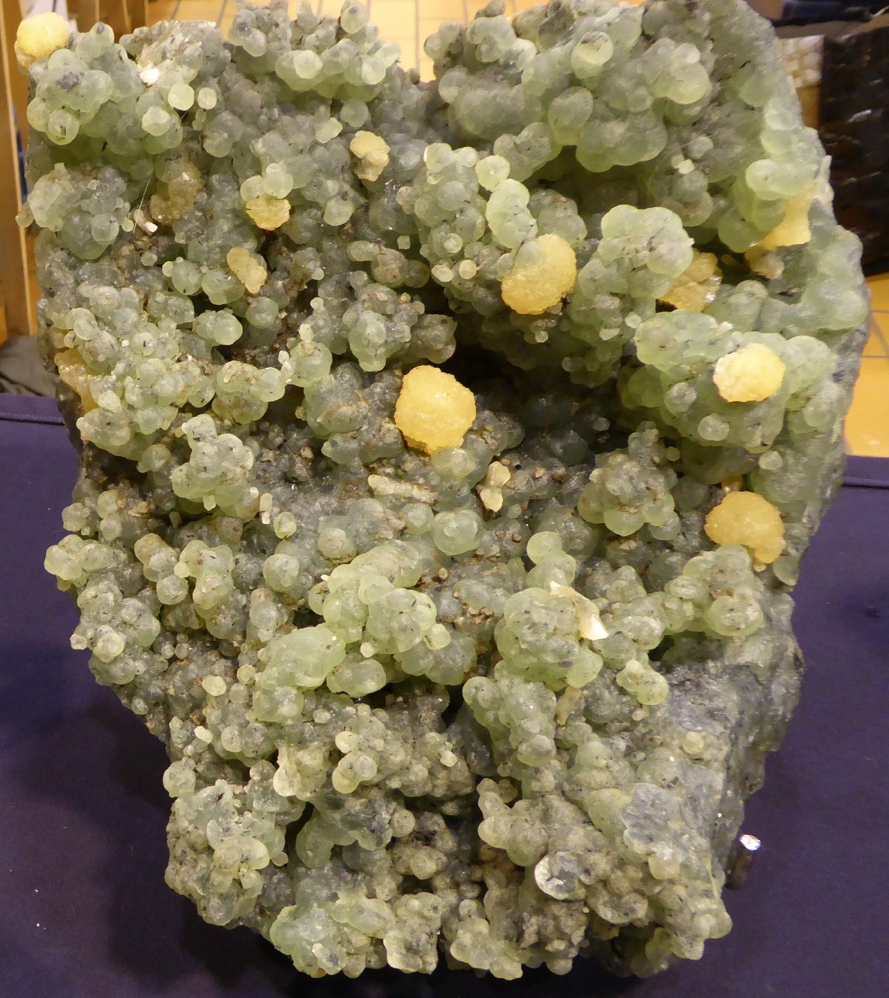 Laurent Godefroy présentait une belle série de minéraux du Mali dont cette grosse pièce de préhnite verte associée à des boules radiées de stilbite.