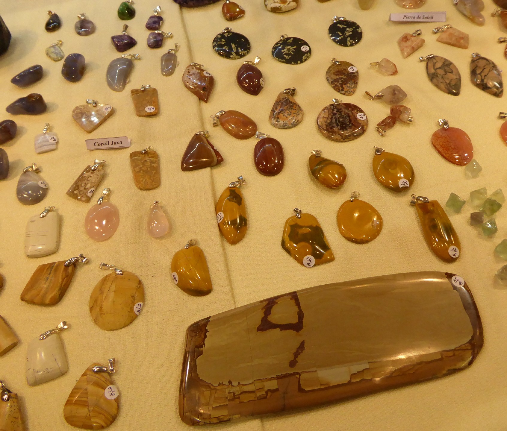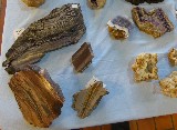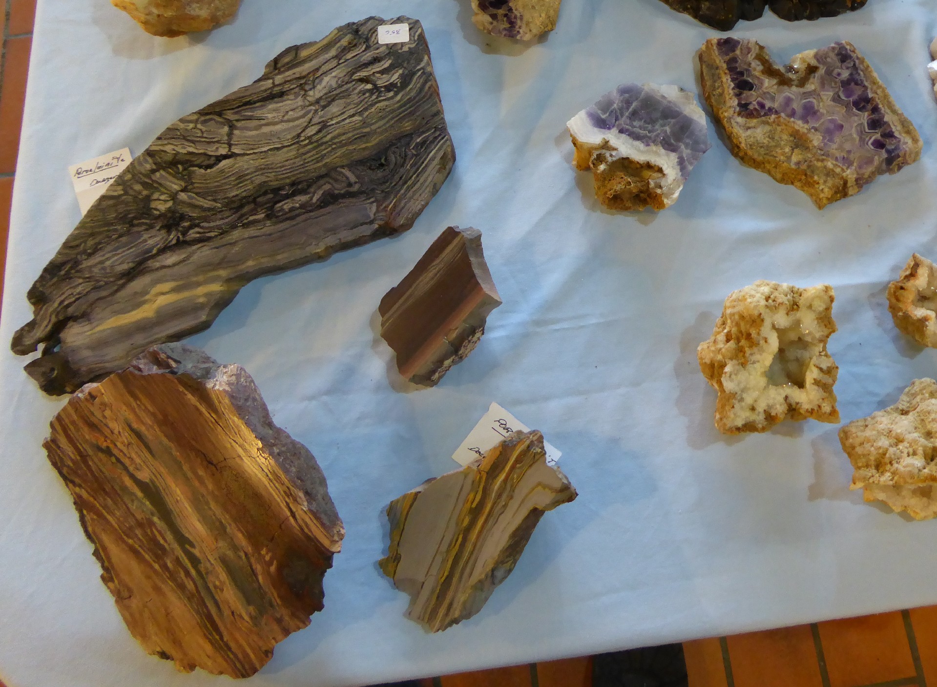 La dernière montre de belles tranches de porcelainite des houillères embrassées de L'Aveyron et des tranches d'améthyste auvergnate. l'exposant les a scié et poli lui même.