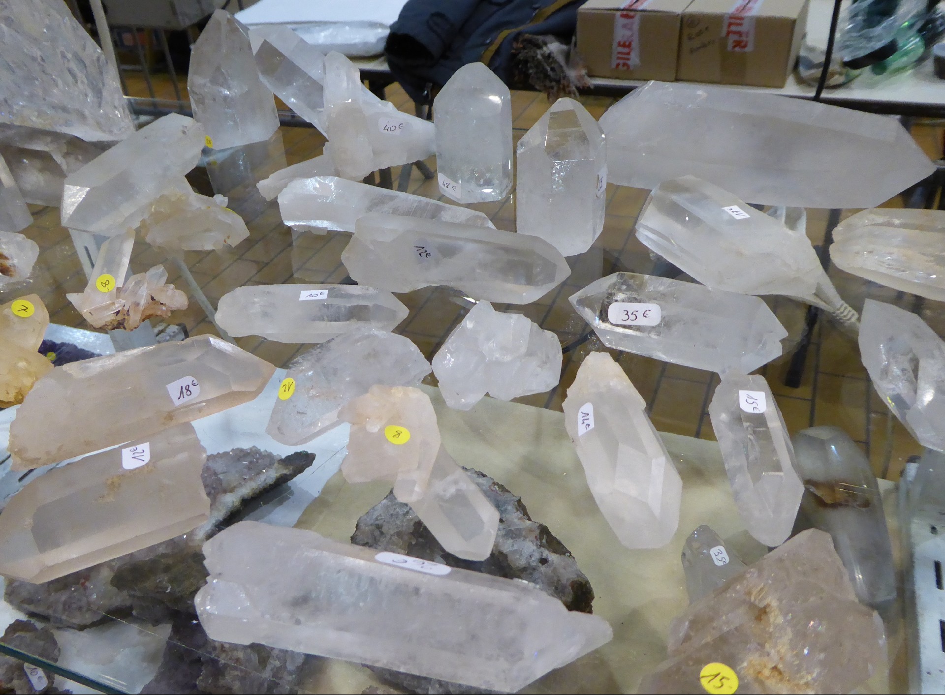 Patrick Cornet présentait une belle série de quartz du Brésil. Ceux ci sont parfois biterminés.