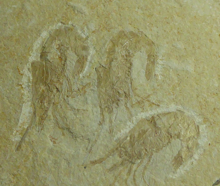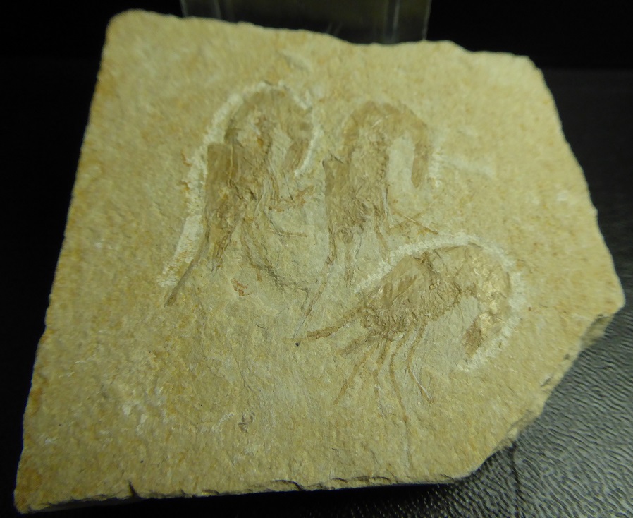 | Description : | Belle plaque montrant 3 crevettes fossiles dont la plus grande mesure 3,5 cm. |