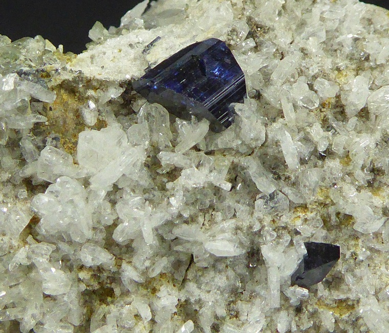 | Anatase, albite, quartz / Monts Zard, District de Kharan, Province du Baloutchistan, Pakistan / Belle pièce composée de 2 cristaux d'anatase bleutée. Le plus grands mesurent 0,4 cm. Ils reposent sur de l'albite gemme avec un éclat nacré. Les cristaux d'albite sont maclés. Au dos se trouvent quelques quartz chloriteux de 0,7 cm pour les plus grands. | Disponible |