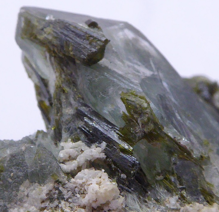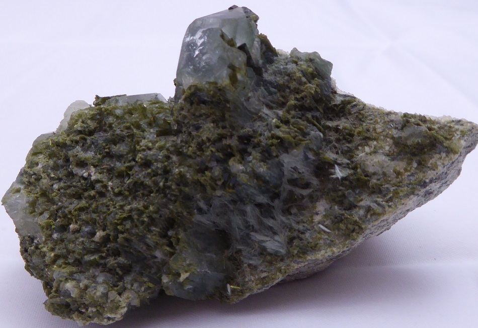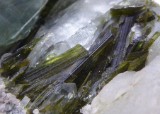 | EPIDOTE sur quartz / Cevins, Savoie, France / Très belle pièce composée d'un quartz transparent de 3 cm piqué d'épidote en baguettes vertes mesurant jusqu'à 1,5 cm, d'un agrégat d'autres cristaux d'épidote et de byssolite fibreuse. | Disponible |