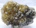 | FLUORITE, calcite, dolomie / Mine Moscona, Solis, secteur minier de Villabona, Asturies, Espagne / Belle pièce de fluorite cubique translucide jaune mesurant jusqu'à 0,7 cm d'arête. Quelques cristaux de dolomie blanche et de calcite se trouve sur la pièce. | Disponible |