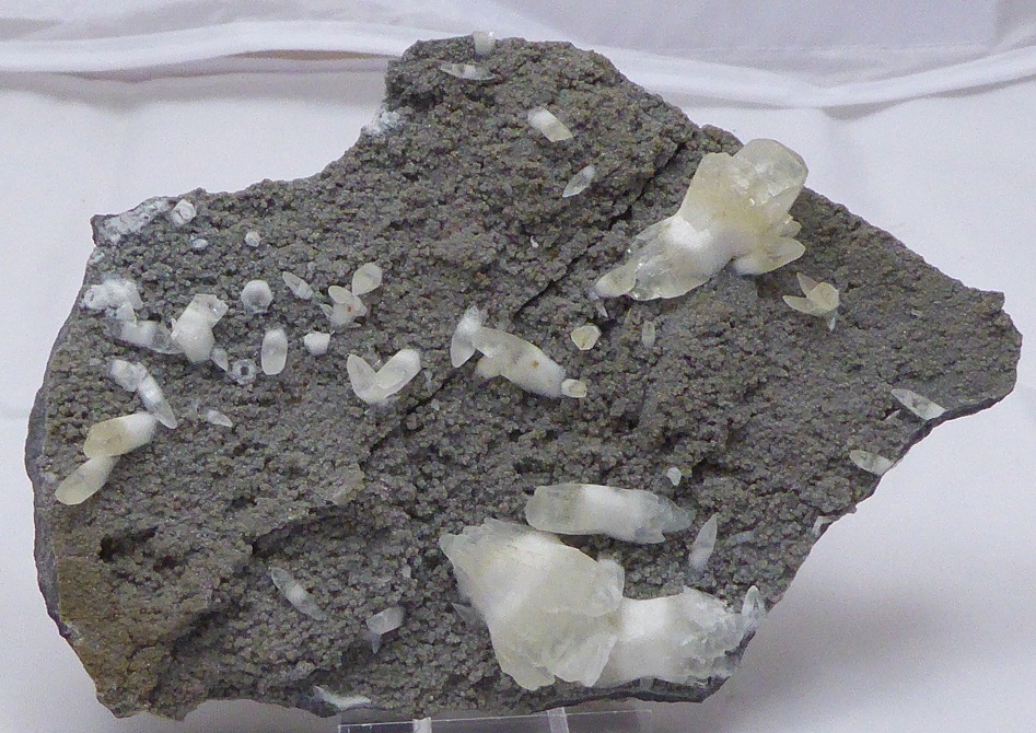 | Description : | Curieuse cristallisation de calcite blanche, transparente à translucide, montrant des scalénoèdres tronqués et parfois biterminés. Les plus grands mesurent 3 cm. La pièce est cristallisée des deux cotés. Au dos, des cristaux sont clivés. |