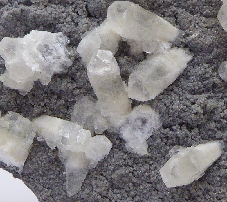 | CALCITE / Mine Elmwood, Carthage, Smith Co., Tennessee, États-Unis / Curieuse cristallisation de calcite blanche, transparente à translucide, montrant des scalénoèdres tronqués et parfois biterminés. Les plus grands mesurent 3 cm. La pièce est cristallisée des deux cotés. Au dos, des cristaux sont clivés. | Disponible |