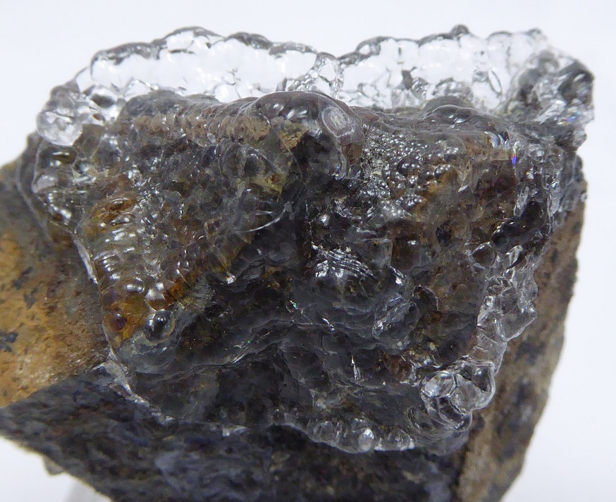 | OPALE (variété Hyalite) / Tarcal, Monts Zemplén, Borsod-Abauj-Zemplén Co., Hongrie / Belle pièce de cette rare variété d'opale nommée Hyalite. La cristallisation est curieuse (botryoïdal globuleuse) et transparente. Elle montre une forte fluorescence verte sous les U. V. courts. | Disponible |