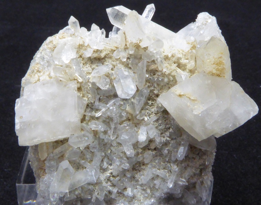 | Description : | Bonne pièce montrant deux cristaux d'adulaire blancs nacre de 1,4 cm pour le plus grand et de quartz transparent de 1 cm. |