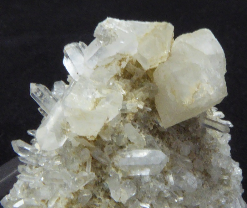 | ADULAIRE, Quartz / Valais, Suisse / Bonne pièce montrant deux cristaux d'adulaire blancs nacre de 1,4 cm pour le plus grand et de quartz transparent de 1 cm. | Disponible |