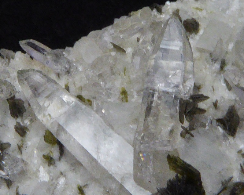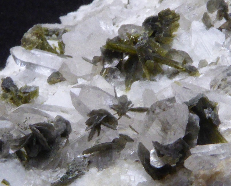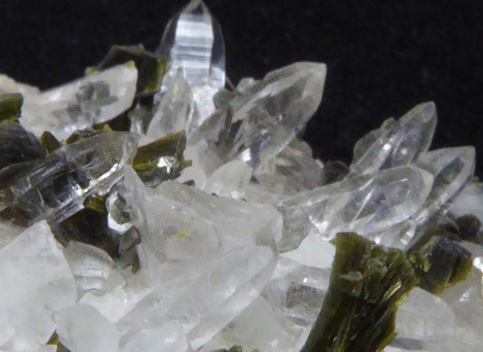 | QUARTZ, Epidote / Vallée Maggio, Tessin, Suisse / Belle pièce esthétique composée de quart hyalin de 1,7 cm pour les plus grand et de baguette d'épidote allant jusqu'à 0,6 cm. | Disponible |
