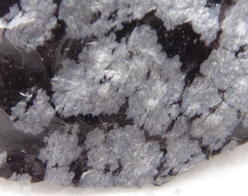 | Description : | Belle pièce montrant des mouches blanche dans de l'obsidienne noire. Ces mouches sont composées de cristobalite. |