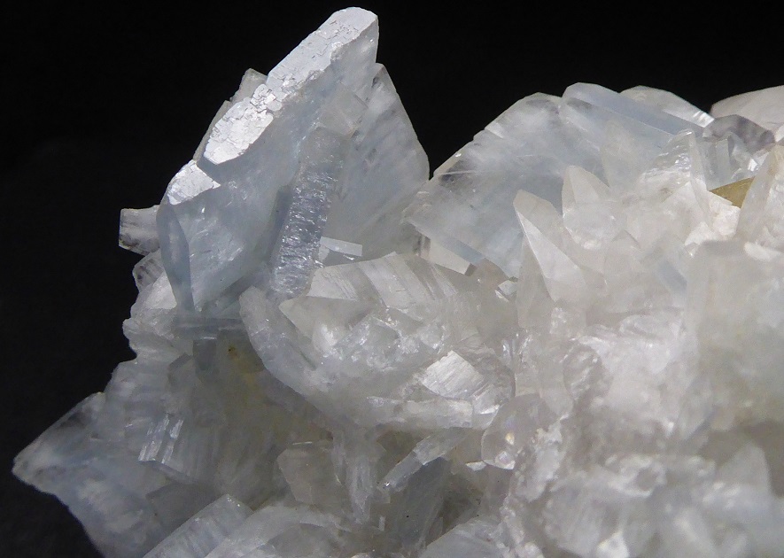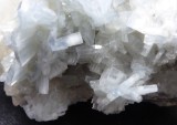| CALCITE, BARYTE / Mine Moscona, Solis, Corvera de Asturias, Asturies, Espagne / Très belle pièce de calcite en scalénoèdres blancs à grisâtres translucide de 2 cm pour les plus grands. Ils sont surmontés de cristaux tabulaires bleus de baryte. Le plus grand mesure 1,5 cm et forme des rosettes. Quelques cristaux de baryte sont clivés. | Disponible |