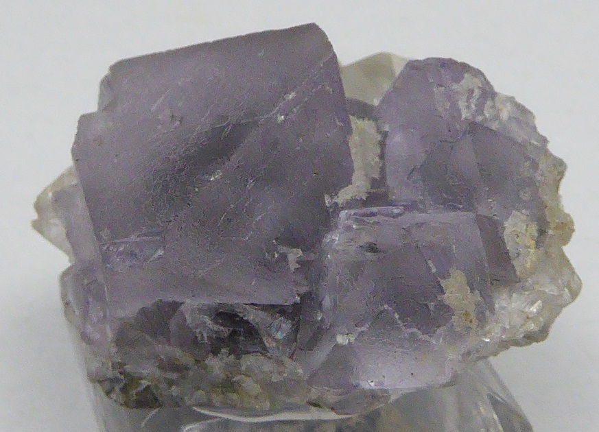 | Description : | Très belle pièce de fluorite octaèdrique légèrement violine. Le plus gros cristal mesure 2 cm. Il a un petit clivage sur une pointe. |