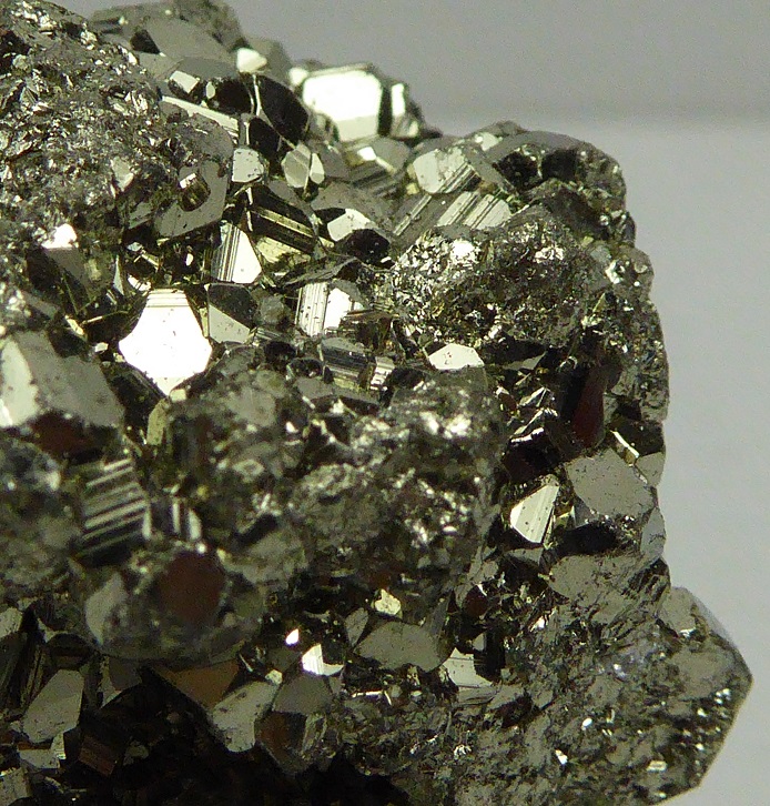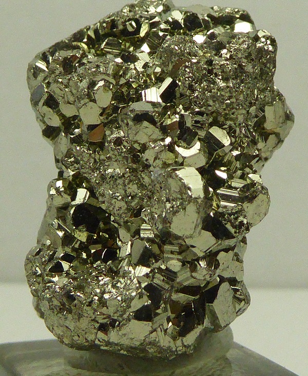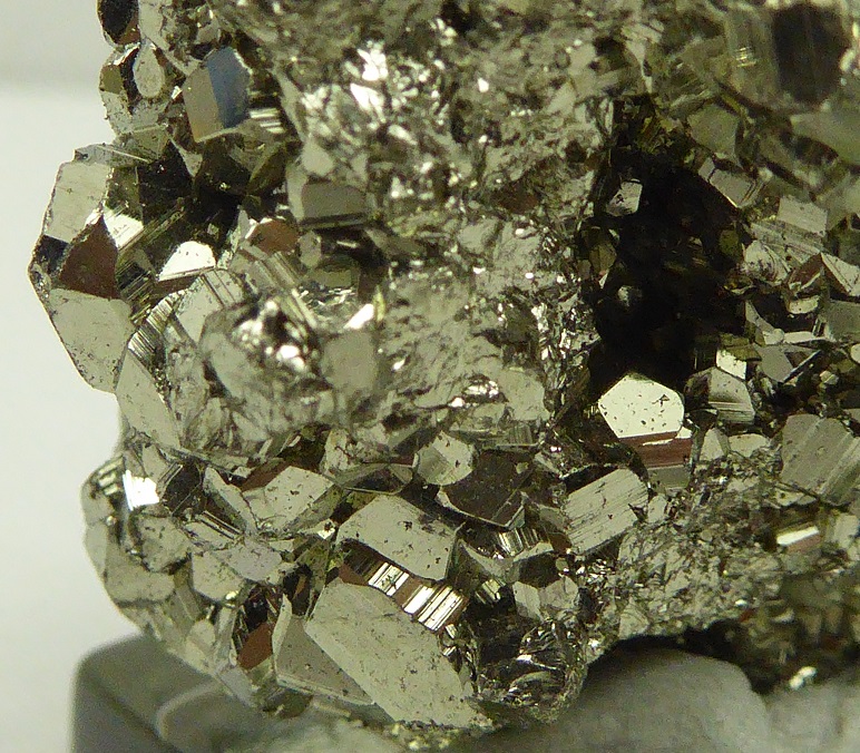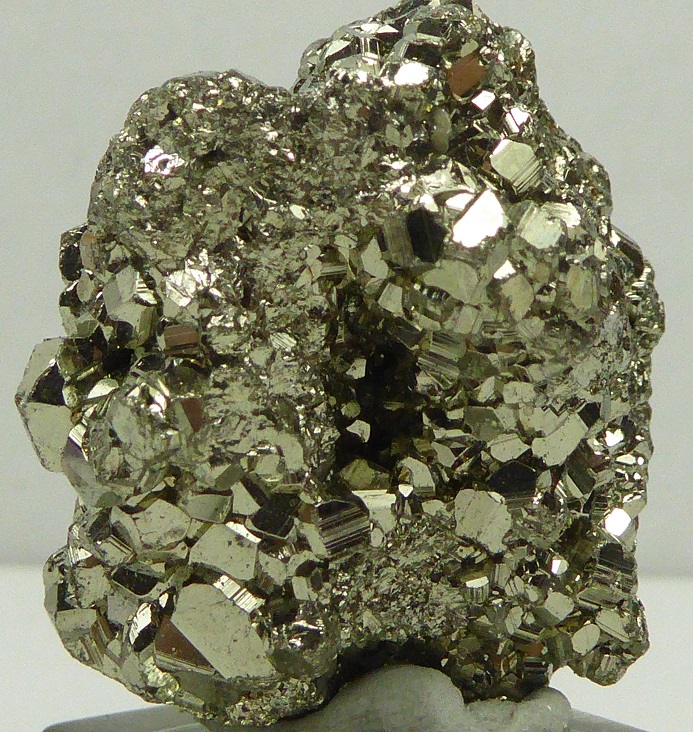 | PYRITE / Mine de Huanzala, district de Huallanca, Ancash, Pérou / Bonne pièce de pyrite cubique montrant des troncatures complexes et des striures sur les faces. Les cristaux sont très brillants à éclat métallique. Les plus grands mesurent 0,3 cm. Quelques cristaux sont érodés sur le coté. | Disponible |