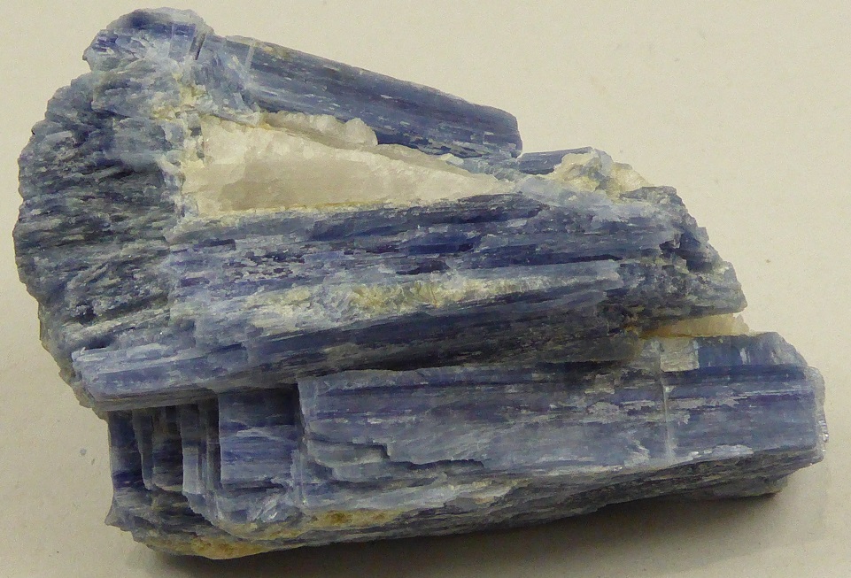 | Description : | Belle pièce composée de cristaux lamellaires de kyanite de couleur bleutée incluse dans du quartz massif transparent. |