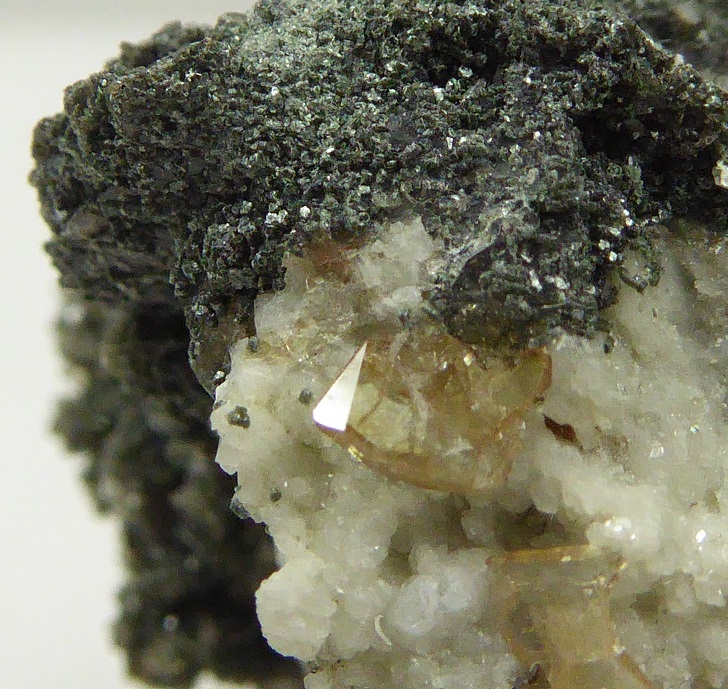 | TITANITE, calcite, albite, chlorite / Vallée de Vorderrhein, Grisons, Suisse / Belle pièce composée d'albite blanche, d'une lame de calciteet de plusieurs titanites jaunes orangées dont un bien cristallisé et transparent de 0,3 cm. de la chlorite vert microcristallisée saupoudre la pièce. | Disponible |