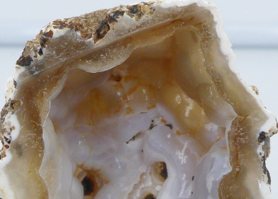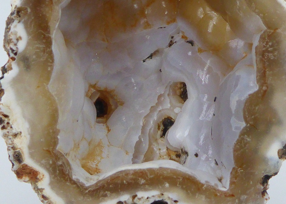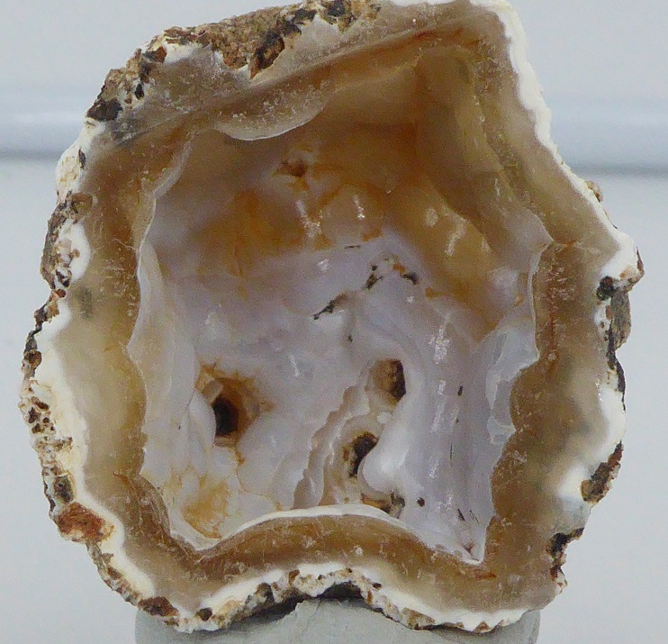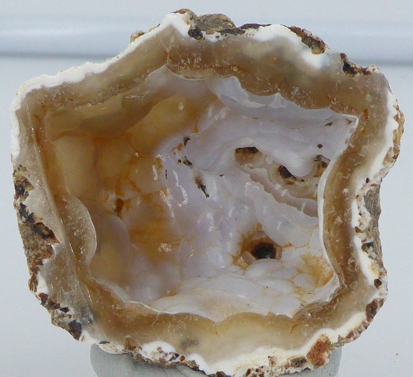 | CALCEDOINE / Mauprévoir, canton de Montmorillon, Vienne, France / Très belle géode de calcédoine mamellonnée montrant une belle brillance et des couleurs allant du blanc au orangée pâle. | Disponible |