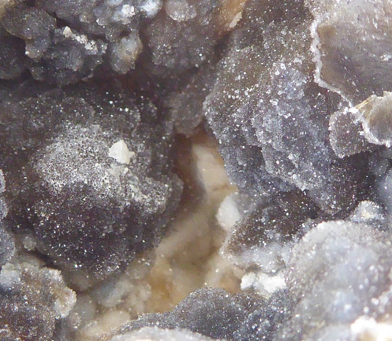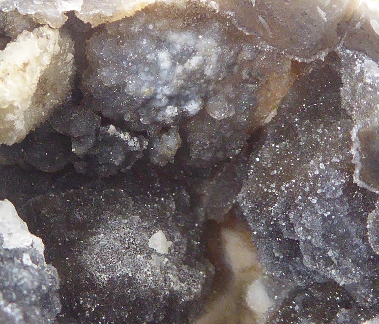 | CALCEDOINE / Mauprévoir, canton de Montmorillon, Vienne, France / Très belle géode de calcédoine mamelonnée noire à blanche recouverte de microcristaux de quartz | Disponible |