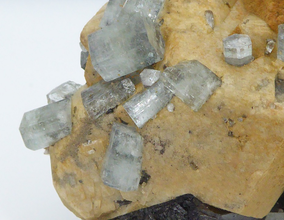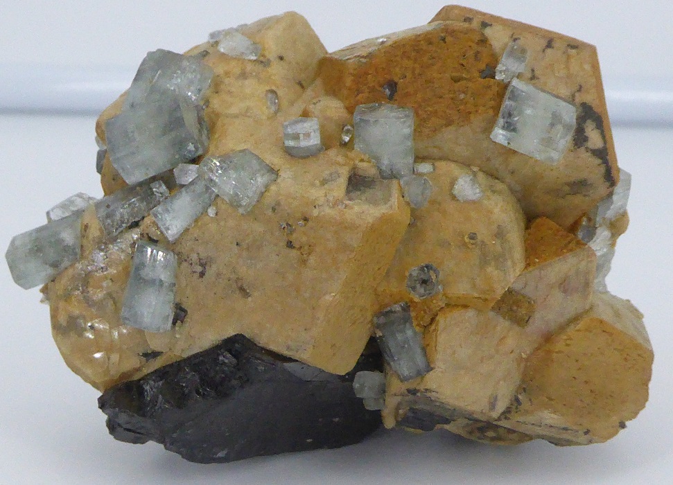 | FLUORAPATITE, sidérite, ferbérite / Panasqueira, district de Castelo Branco, Portugal / Magnifique pièce composée d'une base de ferbérite noire cristallisée, de sidérite jaune crème de 2,5 cm et parsemée de cristaux biterminés de fluoapatite transparents à translucides bleutées mesurant jusqu'à 1 cm. | Disponible |