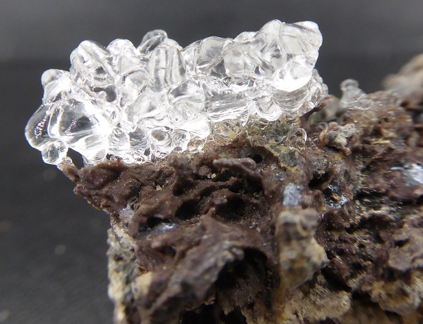 | Description : | Curieux échantillon de cette opale de la variété Hyalite posée sur de l'andésite. Elle montre une belle fluorescence verte sous les U. V. courts. |