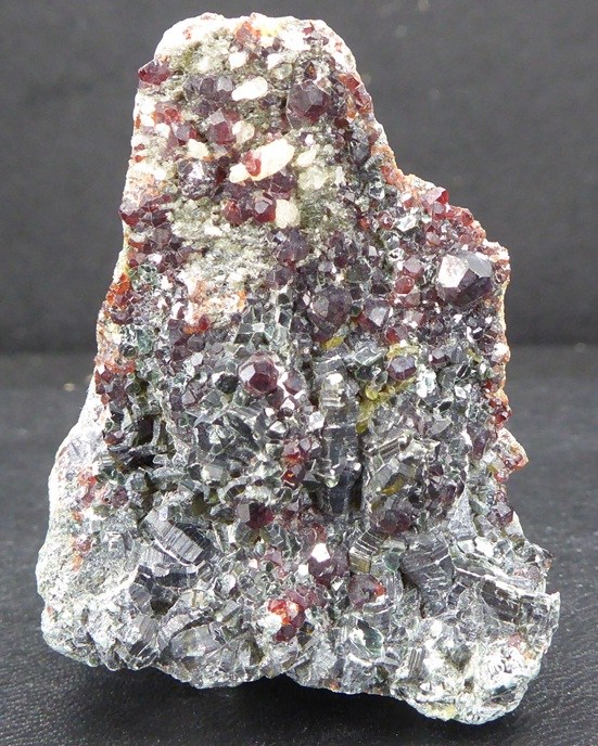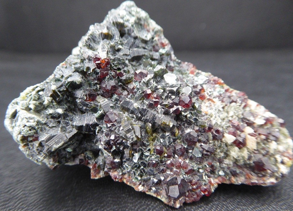 | GROSSULAIRE, CLINOCHLORE / Alchuri, Shigar, Pakistan / Belle pièce composée d'une multitude de grenat de la variété grossulaire rougeâtre posée sur de beaux cristaux de clinochlore mesurant jusqu'à 0,6 cm. Un peu de quartz se trouve sur la pièce. | Disponible |
