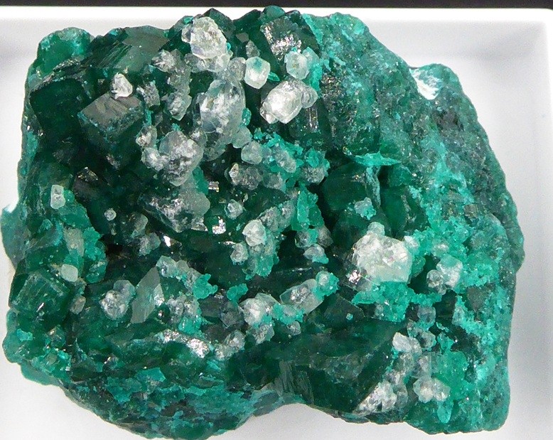 | Description : | Bel échantillon de dioptase d'un beau vert brillant. Les cristaux mesurent 0,3 cm pour les plus grands. Des cristaux blancs de calcite se trouvent sur la dioptase. |
