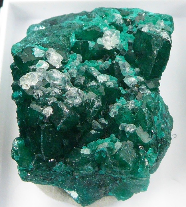 | Rajout Décembre 2025 / DIOPTASE / Mine Tantara, Shinkolobwe, Katanga, R. D. du Congo / Bel échantillon de dioptase d'un beau vert brillant. Les cristaux mesurent 0,3 cm pour les plus grands. Des cristaux blancs de calcite se trouvent sur la dioptase. Livrée dans une boite plexi. | Disponible |