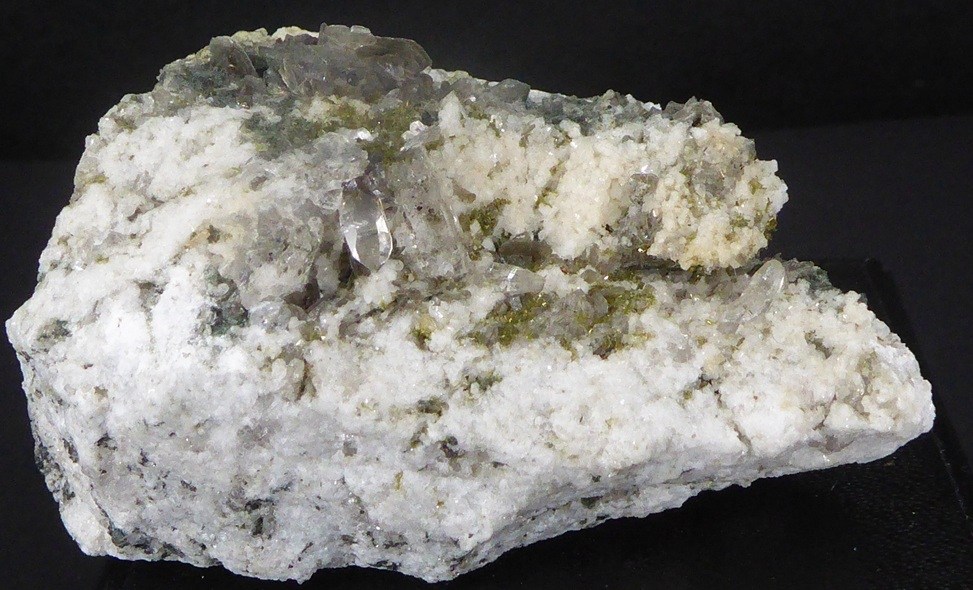 | Description : | Bonne pièce composée de cristaux de quartz hyalin de 0,8 cm pour les plus grands, de mica en feuillets de 0,3 cm et de fins cristaux d'épidote. |