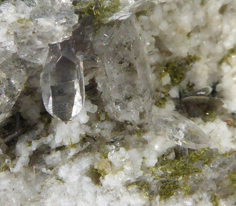 | Rajout Mars 2026 / QUARTZ, EPIDOTE, MICA / Vallée d'Ossola Piémont, Italie / Bonne pièce composée de cristaux de quartz hyalin de 0,8 cm pour les plus grands, de mica en feuillets de 0,3 cm et de fins cristaux d'épidote. | Disponible |