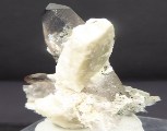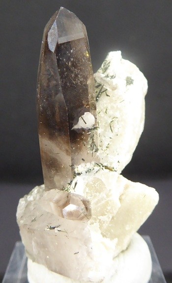 | Rajout Mars 2026 / QUARTZ,AEGIRINE, ALBITE / Mont Malosa, Zomba, Malawi / Très belle cristallisation de quartz enfumé de 3,3 cm montrant un léger fantôme. Il est posé sur de l'albite massive d'où ressort quelques aegirines noires. | Disponible |