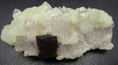 BABINGTONITE, prehnite, quartz, épidote / Hongxi, Meigu, Sichuan, Chine / Superbe pièce composée d'un cristal tabulaire noire de babingtonite de 1,4 cm, de prehnite mamellonnée verte d? cm et de petits cristaus verts d'épidote. Le tout repose sur du quartz transparent de 1,5 cm pour les plus grands.