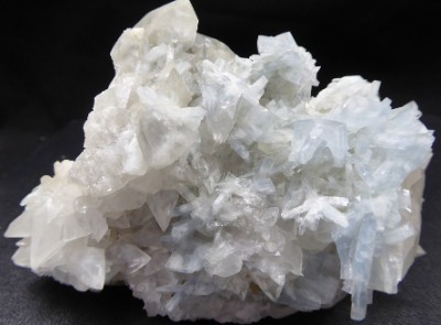 CALCITE, BARYTE / Mine Moscona, Solis, Corvera de Asturias, Asturies, Espagne / Très belle pièce de calcite en scalénoèdres blancs à grisâtres translucide de 2 cm pour les plus grands. Ils sont surmontés de cristaux tabulaires bleus de baryte. Le plus grand mesure 1,5 cm et forme des rosettes. Quelques cristaux de baryte sont clivés.