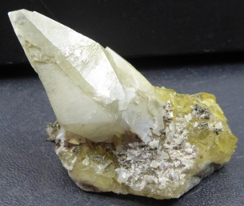 CALCITE, fluorite / Mine Moscona, Solis, Corvera de Asturias, Asturies, Espagne / Belle pièce de fluorite jaune en cristaux cubiques dont les arêtes les plus grandes mesurent 0,5 cm. Deux scalénoèdres accollées de calcite surmontent la fluorite. Le plus grands mesure 4 cm.