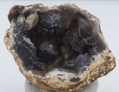CALCEDOINE / Mauprévoir, canton de Montmorillon, Vienne, France / Très belle géode de calcédoine mamelonnée noire à blanche recouverte de microcristaux de quartz
