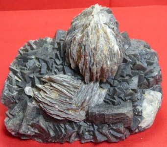 FLUORITE, BARYTE / Mine du rossignol, Chaillac, Indre, France / Bonne pîèce de fluorite cubique grise à noire dûe à des inclusions de galène. Le plus grand mesure 3 cm. deux pompons de baryte crétée sont poséessur la fluorite. Le plus grand mesure 6 cm.
