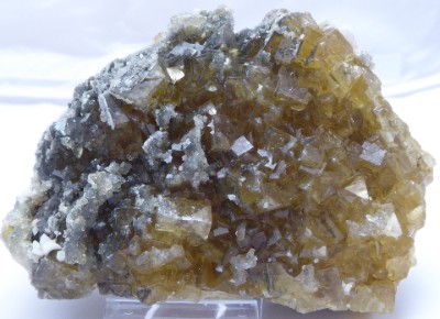 FLUORITE, quartz / Mine de Marsanges, Langeac, Haute-Loire, France / Très belle pièce de fluorite cubique légèrement verdâtre recouverte par endroit de microcristaux de quartz. Le cube le plus grand mesure 2,5 cm.
