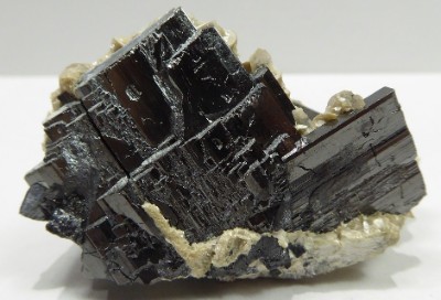 FERBERITE, arsénopyrite / Mine Panasqueira, Covilhã, Castelo Branco, Portugal / Superbe échantillon composé de plusieurs cristaux de ferbérite noire montrant des faces brillantes. Un cristal d'arsénopyrite de 1 cm se trouve sur la ferbérite.