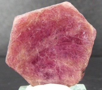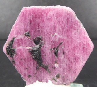 RUBIS (variété de corindon) / District d'Ampanihy, région sud-ouest, province de Tuléar, Madagascar / Beau cristal de rubis hexagonal, tabulaire et d'une belle couleur rouge. Un peu de phlogopite (mica) se trouve inclus dans le rubis.